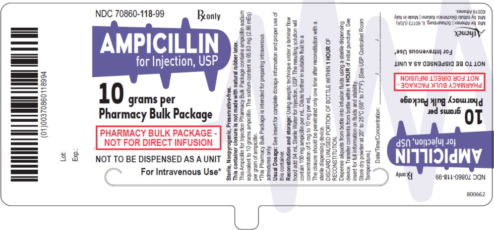 The following 2 images provide visual information about the product associated with Ampicillin NDC 70860-118 by Athenex Pharmaceutical Division, Llc., such as packaging, labeling, and the appearance of the drug itself. This resource could be helpful for medical professionals, pharmacists, and patients seeking to verify medication information and ensure they have the correct product.