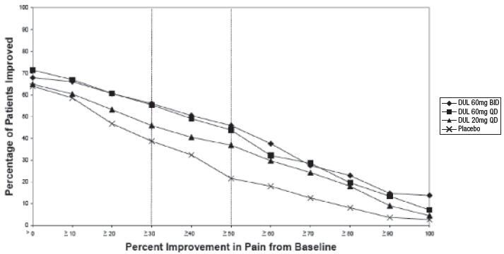 This is a graph showing the percentage improvement in pain from baseline for patients taking either a placebo or Duloxetine (DUL) at either 60mg or 120mg doses, once daily. The graph ranges from 0 to 100 and shows the percentage of patients who have improved their pain levels. There is no further information available.*