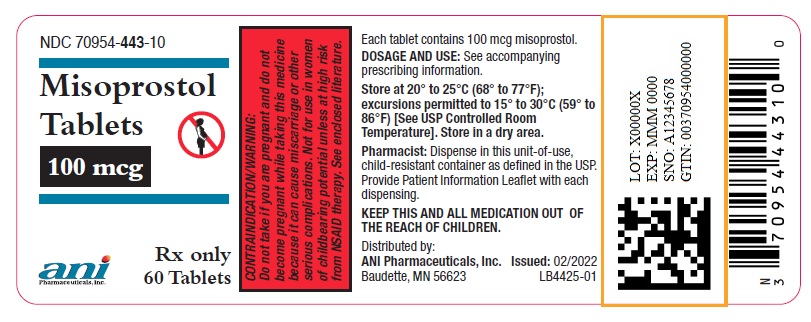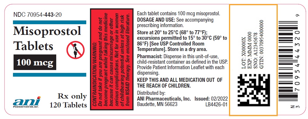 This medication is identified as NDC 70954-443-10 which contains 100 mg misoprostol per tablet. The dosage and use instructions are not provided and need to be obtained from the accompanying prescribing information. The tablets should be stored in a dry area between 20-25°C, with permitted excursions between 15-30°C. The pharmacist should dispense this medication in a child-resistant container and provide patient information leaflets with each dispensing. It is crucial to keep this and all medication out of the reach of children. This product is distributed by ANI Pharmaceuticals, and it's only available with a prescription.*