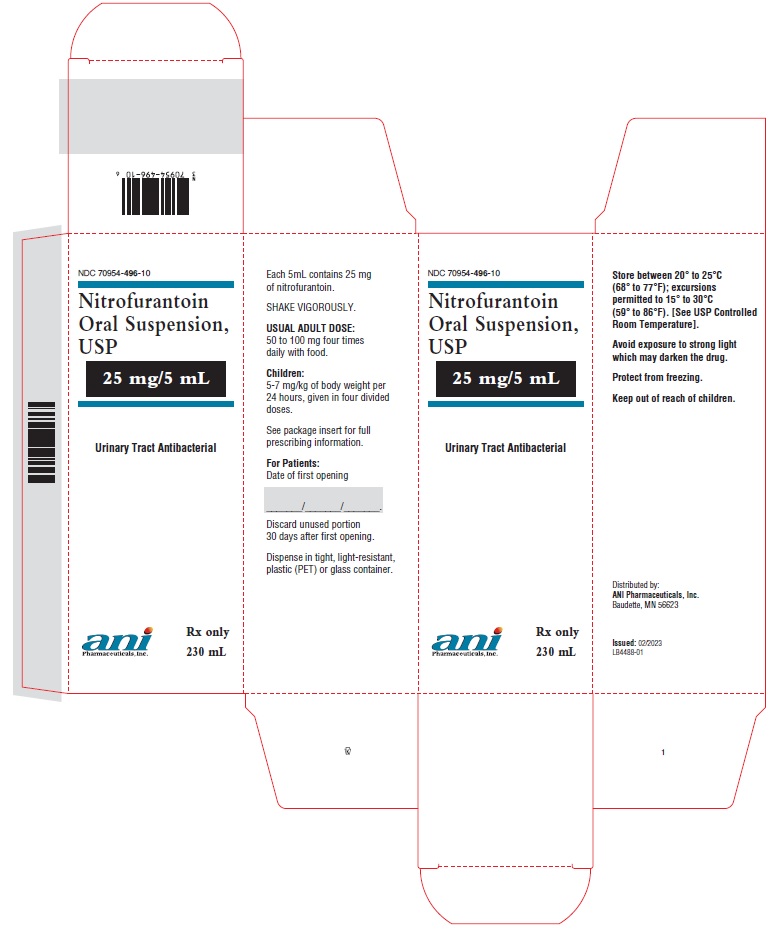 NDC 70954-496-10 is an oral suspension containing Nitrofurantoin, which is an antibacterial medication used to treat urinary tract infections. Each 5 mL of the suspension contains 25 mg of nitrofurantoin. The recommended adult dose is 50 to 100 mg four times daily with food. For children, the recommended dose is 5-7 mg/kg of body weight per 24 hours, given in four divided doses. The suspension should be shaken vigorously before use and should be stored in a tight, light-resistant, plastic (PET) or glass container between 20° to 25°C (68° to 77°F), with excursions permitted to 15° to 30°C (59° to 86°F). The drug should be protected from freezing and strong light. The package insert provides full prescribing information. The suspension is distributed by ANI Pharmaceuticals, Inc. and should be discarded 30 days after first opening.*