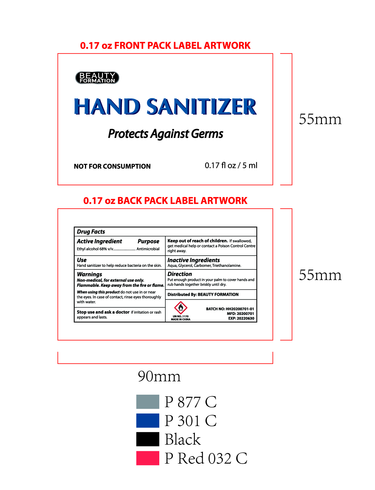 This is a pack of hand sanitizer that contains 0.17 oz or 5 ml of liquid. It is designed to protect against germs and features an active ingredient, Ethylalcohol 68% which is antimicrobial. It comes with usage instructions and must be kept away from flames due to its flammability nature. The pack also comes with some warnings to guide against irritation, rash, and not to use near eyes. It is distributed by Beauty Formation and includes drug facts, ingredients, and expiry date.*