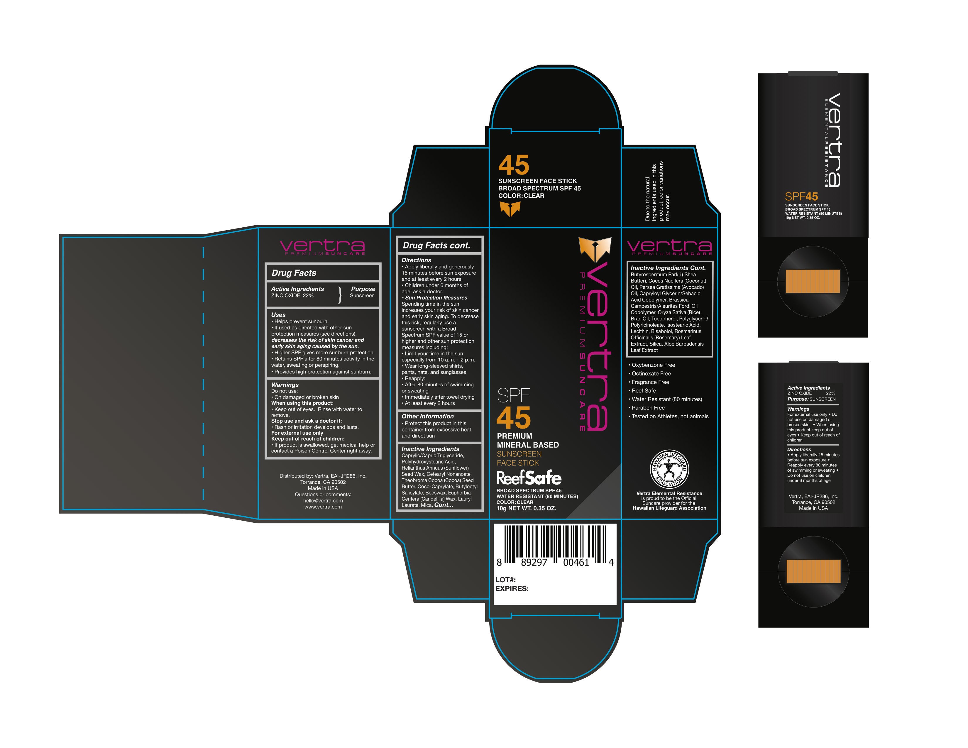 This is a sunscreen stick with SPF 45 that contains zinc oxide as the active ingredient. It helps prevent sunburn and protects against skin cancer and early skin aging caused by the sun. The sunscreen retains SPF after 80 minutes of activity in water, sweating, or perspiring. It provides high protection against sunburn, but should not be used on damaged or broken skin. The product should be kept out of eyes, and if rash or irritation develops, the user should discontinue use. The sunscreen should be applied liberally and generously 15 minutes before sun exposure and reapplied every 2 hours. It is water-resistant for up to 80 minutes and does not contain oxybenzone, octinoxate, paraben, or animal products. The inactive ingredients include caprylic/capric triglyceride, polyhydroxystearic acid, helianthus annuus (sunflower) seed wax, beeswax, and shea butter. It is made in the USA and distributed by Vertra, EAI-JR286, Inc.*