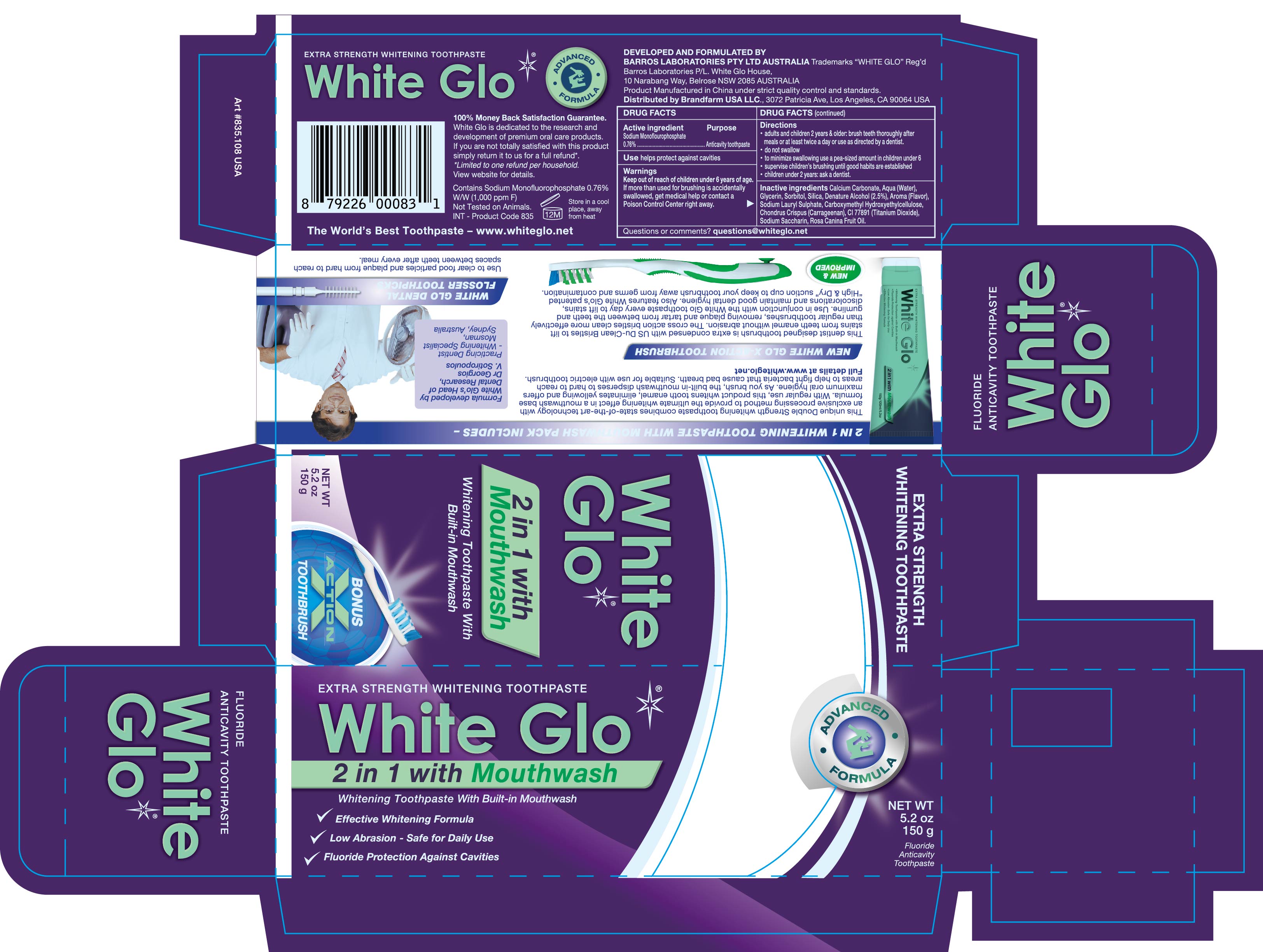 This is a description of White Glo extra-strength whitening toothpaste, which is manufactured in China under strict quality control and standards by Barros Laboratories PTY Ltd in Australia. The product includes active ingredients such as sodium monofluorophosphate to help protect against cavities, as well as inactive ingredients including calcium carbonate and sodium saccharin. White Glo is dedicated to the research and development of premium oral care products, and their toothpaste is not tested on animals. The product comes in a 5.2 oz tube and is an effective whitening formula with built-in mouthwash, offering low abrasion and safe use for daily fluoride protection against cavities. If not satisfied, customers can return the product for a full refund. This text also includes manufacturer contact information and instructions for safe use.*