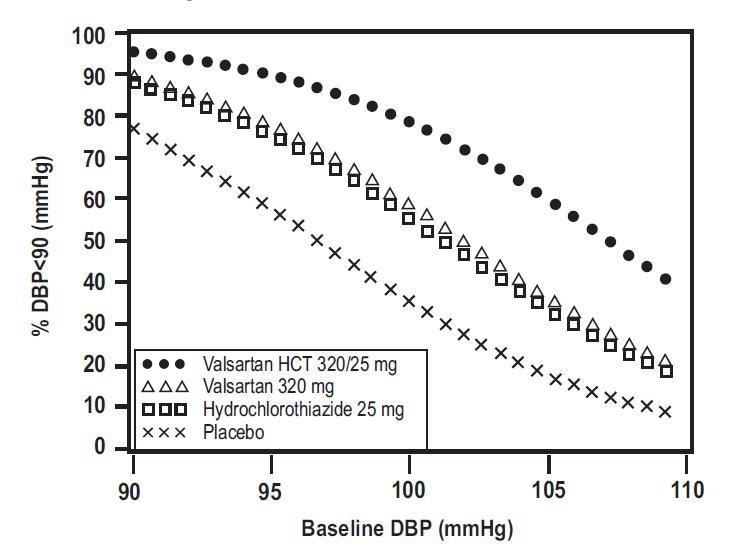 This is a table comparing the effect of Valsartan HCT 320/125mg and Valsartan 320mg with Hydrochlorothiazide 25mg and a placebo on DBP (diastolic blood pressure) in mmHg. The baseline DBP is also mentioned.*