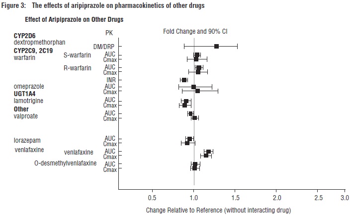 The text suggests a figure (Figure 3) showing the effects of aripiprazole on the pharmacokinetics of other drugs. The figure likely demonstrates the fold change and 90% confidence interval for the changes in parameters such as AUC and Cmax for drugs including extropmethorphan, Swartarin, Revartarin, omeprazole, lamotrigine, valproate, lorazepam, yontane, and O-desmethyivenlafaxine. The changes appear to range from 5% to 30%.*