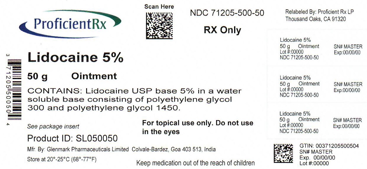 Lidocaine Ointment USP, 5% is available in 35.44 g (1¼ oz) laminate tubes with a child-resistant cap (NDC 71205-500-44) and 283.52 g shrink wrapped pack of 8 (NDC 71205-500-52).