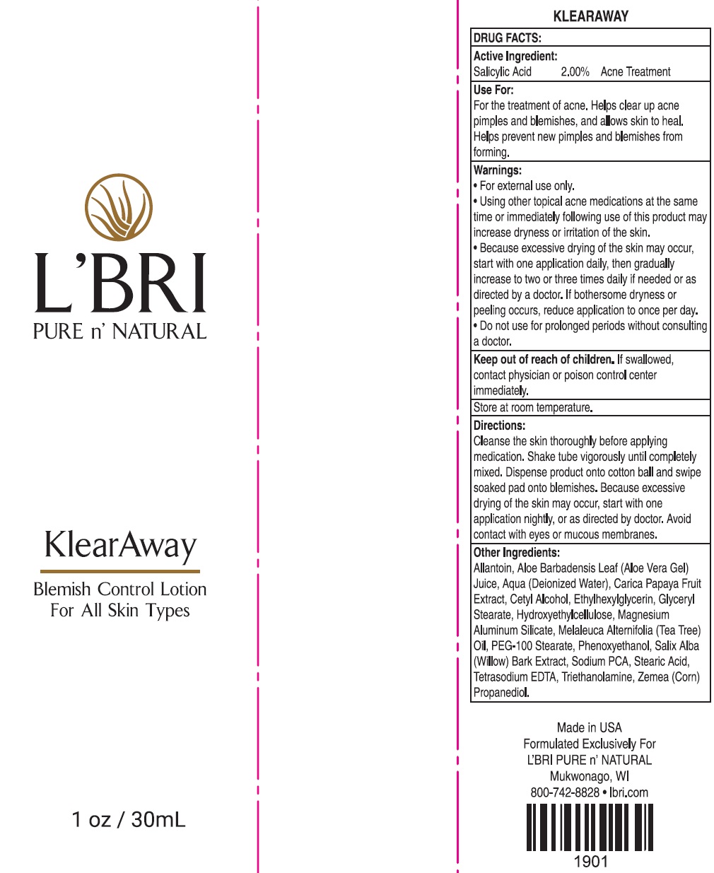 This is a description of the KlearAway Blemish Control Lotion by L'BRI PURE n" NATURAL. It contains 2.00% Salicylic Acid as the active ingredient for acne treatment. The lotion helps clear up acne pimples and blemishes, allowing the skin to heal and preventing new breakouts. It is suitable for all skin types. The product should be used externally only and precautions should be taken to avoid excessive drying of the skin. The directions advise cleansing the skin before applying the lotion, and it is recommended to start with one application nightly. The formulation includes ingredients such as Aloe Vera Gel, Tea Tree Oil, and Willow Bark Extract. It is manufactured in the USA exclusively for L'BRI PURE n" NATURAL.*