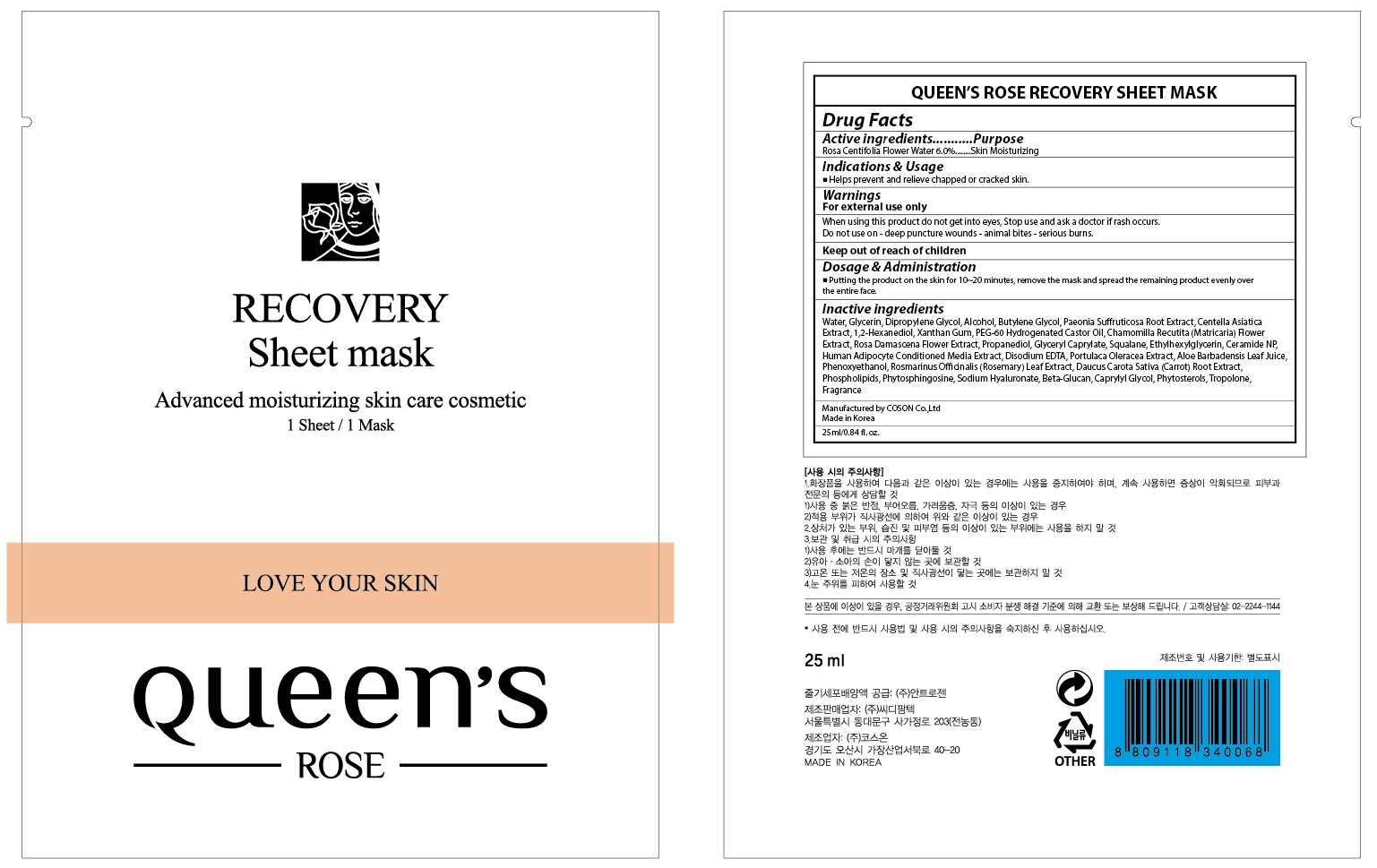 The text is about a Queen's Rose Recovery Sheet Mask with drug facts, active ingredients, warnings, and dosage administration. The advanced moisturizing skincare cosmetic is designed to help prevent and relieve chapped or cracked skin with various inactive ingredients. The text also mentions the manufacturer's name and address but doesn't provide any product usage or quality information.*