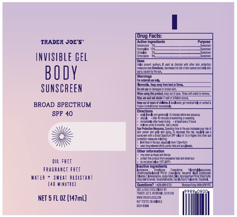 This is a description of Trader Joe's Invisible Gel Body Sunscreen with broad-spectrum SPF 40. It is oil-free, fragrance-free, water-resistant, and sweat-resistant for up to 40 minutes. The product contains 5 fl oz (147mL) and comes with drug facts, active ingredients, directions, warnings, and other information. Designed for use on the body, this sunscreen is designed to provide effective sun protection.*