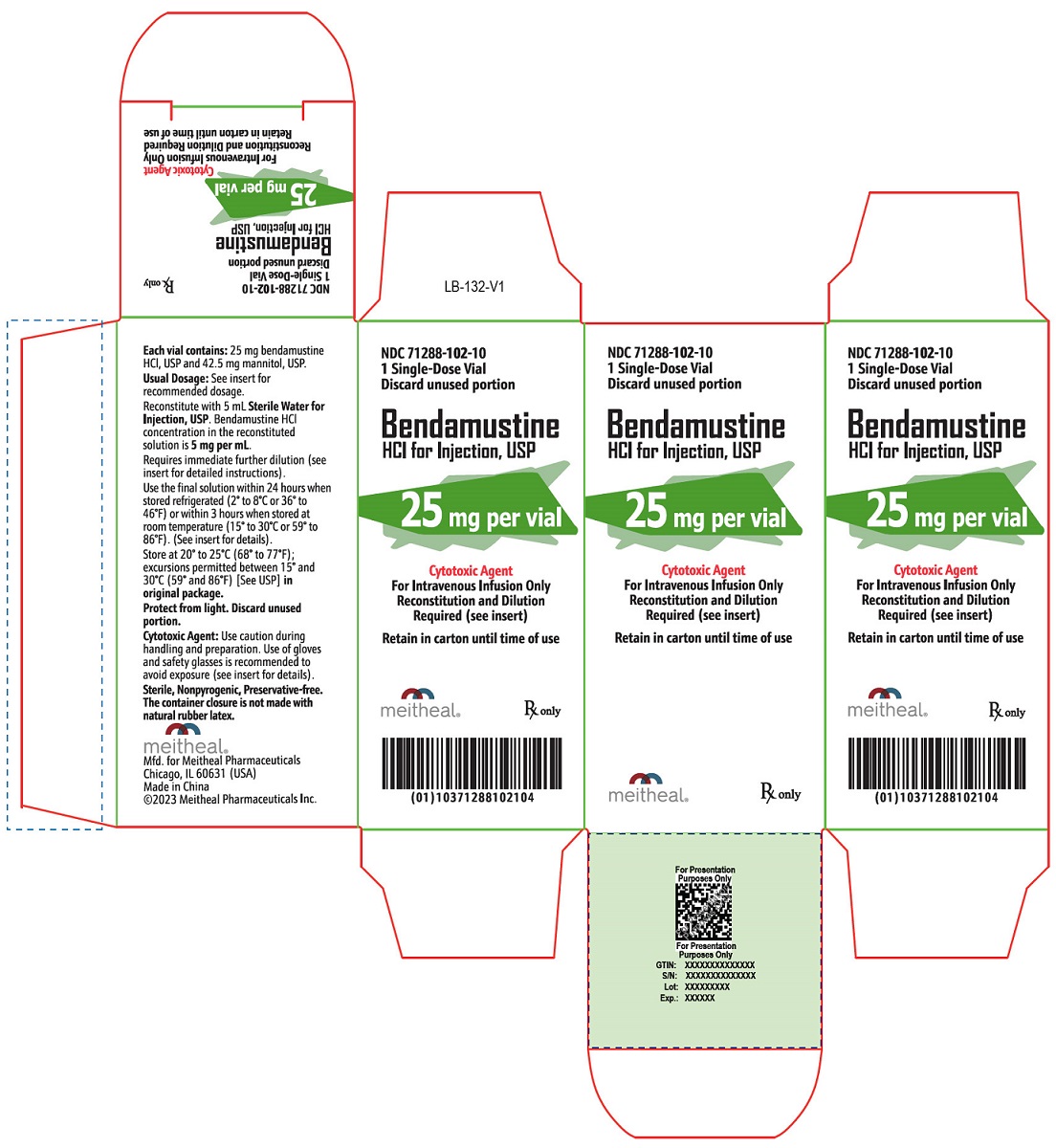 The following 6 images provide visual information about the product associated with Bendamustine NDC 71288-102 by Meitheal Pharmaceuticals Inc., such as packaging, labeling, and the appearance of the drug itself. This resource could be helpful for medical professionals, pharmacists, and patients seeking to verify medication information and ensure they have the correct product.