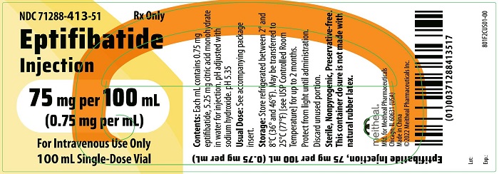 The following 6 images provide visual information about the product associated with Eptifibatide NDC 71288-413 by Meitheal Pharmaceuticals Inc., such as packaging, labeling, and the appearance of the drug itself. This resource could be helpful for medical professionals, pharmacists, and patients seeking to verify medication information and ensure they have the correct product.