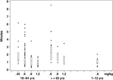 Figure 1: Time to 80% or Greater Block vs. Initial Dose of Rocuronium Bromide by Age Group