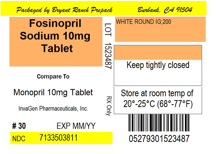 This is a description of a medication package containing Fosinopril, a type of drug used to treat high blood pressure. The package contains white, round tablets with "IG" and "200" printed on them, with a Sodium 10mg content. The medication is comparable to Monopril 10mg Tablets and is stored at room temperature between 20°-25°C (68°-77°F). The package comes in a quantity of 30 tablets and has an expiration date of MM/YY. The NDC number is 7133503811 05279301523487.*