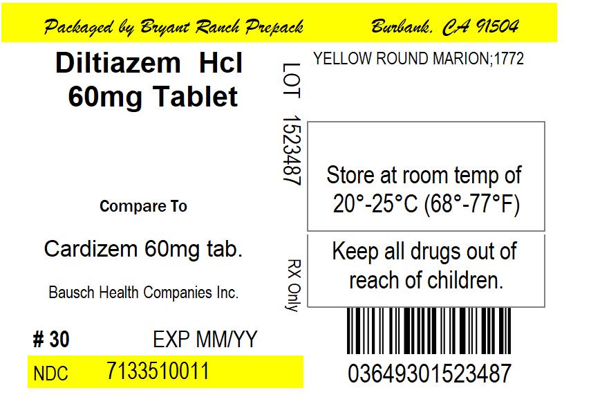 • Sublingual NTG may be taken as required to abort acute anginal attacks during diltiazem hydrochloride therapy.• Prophylactic Nitrate Therapy. Diltiazem hydrochloride may be safely coadministered with short- and long-acting nitrates, but there have been no controlled studies to evaluate the antianginal effectiveness of this combination.• Beta-blockers. (See WARNINGS and PRECAUTIONS.)30 mg – Diltiazem Hydrochloride tablets may be swallowed whole, crushed, or chewed. Do not split Diltiazem Hydrochloride tablets. 60 mg, 90 mg, and 120 mg – Diltiazem Hydrochloride tablets may be swallowed whole, crushed, or chewed.