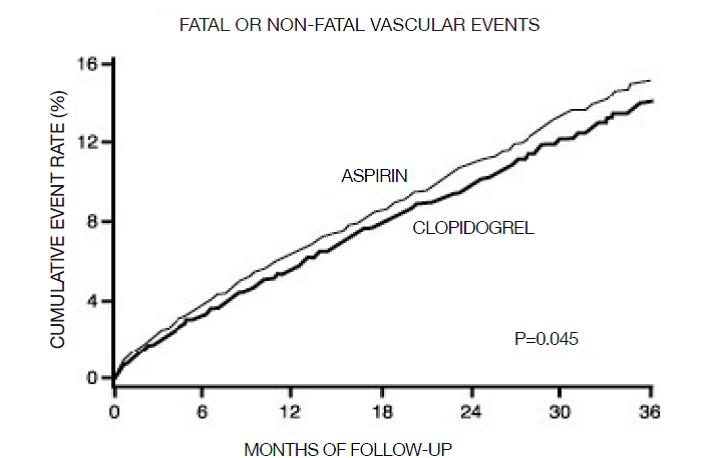 This appears to be a chart or graph displaying the cumulative event rate (in percentage) for fatal or non-fatal vascular events observed over a period of 24 months of follow-up. The chart compares the event rates for two different treatments - Aspirin and Clopidogrel. The variables "n", "@", and "&" do not seem to provide any additional information and may have been misread by the .*