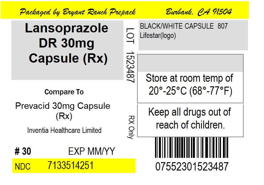 This appears to be a medication label for Lansoprazole, a drug used to treat stomach ulcers and acid reflux. The label includes dosage information (30mg) and storage instructions (room temperature). The manufacturer is listed as Inventia Healthcare Limited. The label also includes the drug's National Drug Code (NDC) number.*