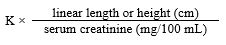 This appears to be a set of medical instructions or guidelines. It includes a formula for calculating a weight-dependent value based on age, as well as separate values for serum creatinine levels for men and women. However, without additional context or information it is difficult to provide a more detailed or specific description.*