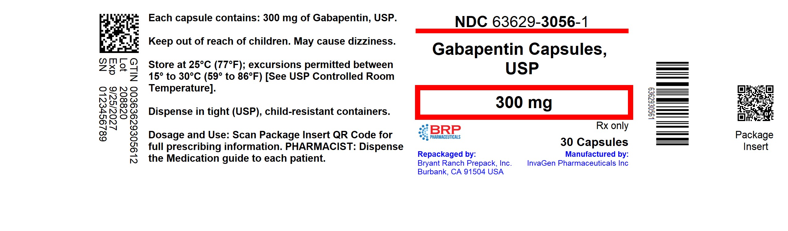 This text provides information about Gabapentin capsules containing 300 mg of Gabapentin, USP. The capsules come with specific storage instructions and a unique National Drug Code (NDC) for identification. It also mentions the importance of keeping the medication out of reach of children due to potential dizziness side effects. Additionally, it advises scanning the QR code for full prescribing information and indicates that the product is for prescription-only use. The text also includes details of packaging and manufacturing by Bryant Ranch Prepack, Inc. and InvaGen Pharmaceuticals Inc.*