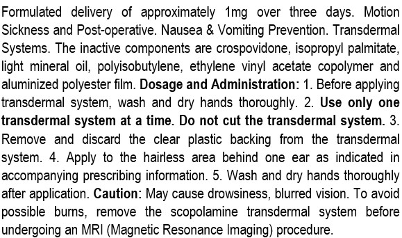 Each transdermal system contains 1.3 mg of scopolamine formulated to deliver approximately 1 mg over 3 days. It is recommended to use only one transdermal system at a time. Store the system upright at 20°C to 25°C (68°F to 77°F) and keep it out of reach of children. The dosage and administration details can be obtained by scanning the package insert's QR code. This medication may cause drowsiness and blurred vision. Ensure the foil seal is intact before use. If the seal is broken, do not use the system.*