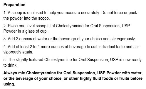 This text provides instructions on how to prepare Cholestyramine for Oral Suspension, USP. It recommends using the enclosed scoop to measure the powder accurately and to avoid forcing or packing the powder. It instructs to mix one level scoopful of the Cholestyramine powder in a glass or cup with 2 ounces of water or a beverage of choice, stirring vigorously. Additional 2 to 4 ounces of beverage can be added according to individual taste preferences. The preparation is ready to drink once the slightly textured Cholestyramine for Oral Suspension, USP is fully mixed. It emphasizes the importance of mixing the powder with water, beverages, or other highly fluid foods before consumption.*
