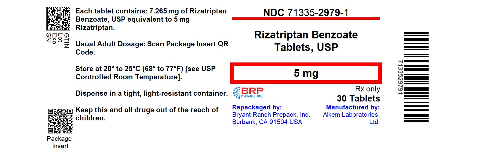 The following 5 images provide visual information about the product associated with Rizatriptan Benzoate NDC 71335-2979 by Bryant Ranch Prepack, such as packaging, labeling, and the appearance of the drug itself. This resource could be helpful for medical professionals, pharmacists, and patients seeking to verify medication information and ensure they have the correct product.