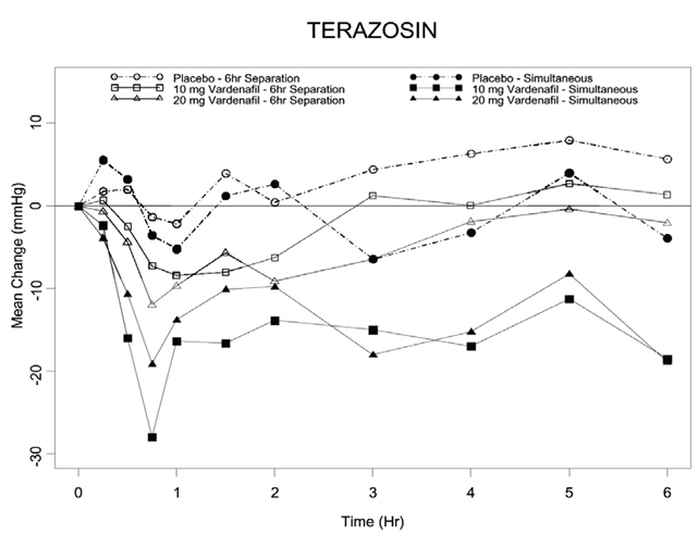 This appears to be a graph showing the mean change in blood pressure (measured in mmHg) over time (measured in hours) for a study comparing a placebo to different doses of a drug called vardenafil (at 5mg and 10mg doses). Beyond that, there is not enough information to provide a more specific description.*