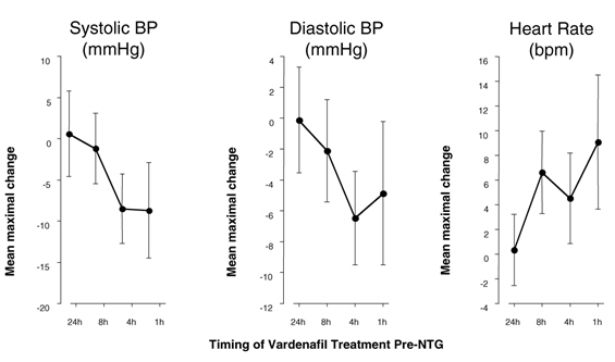 Antihypertensives: Vardenafil hydrochloride tablets may add to the blood pressure lowering effects of antihypertensive agents. In a clinical pharmacology study of patients with erectile dysfunction, single doses of vardenafil 20 mg caused a mean maximum decrease in supine blood pressure of 7 mmHg systolic and 8 mmHg diastolic (compared to placebo), accompanied by a mean maximum increase of heart rate of 4 beats per minute. The maximum decrease in blood pressure occurred between 1 and 4 hours after dosing. Following multiple dosing for 31 days, similar blood pressure responses were observed on Day 31 as on Day 1.