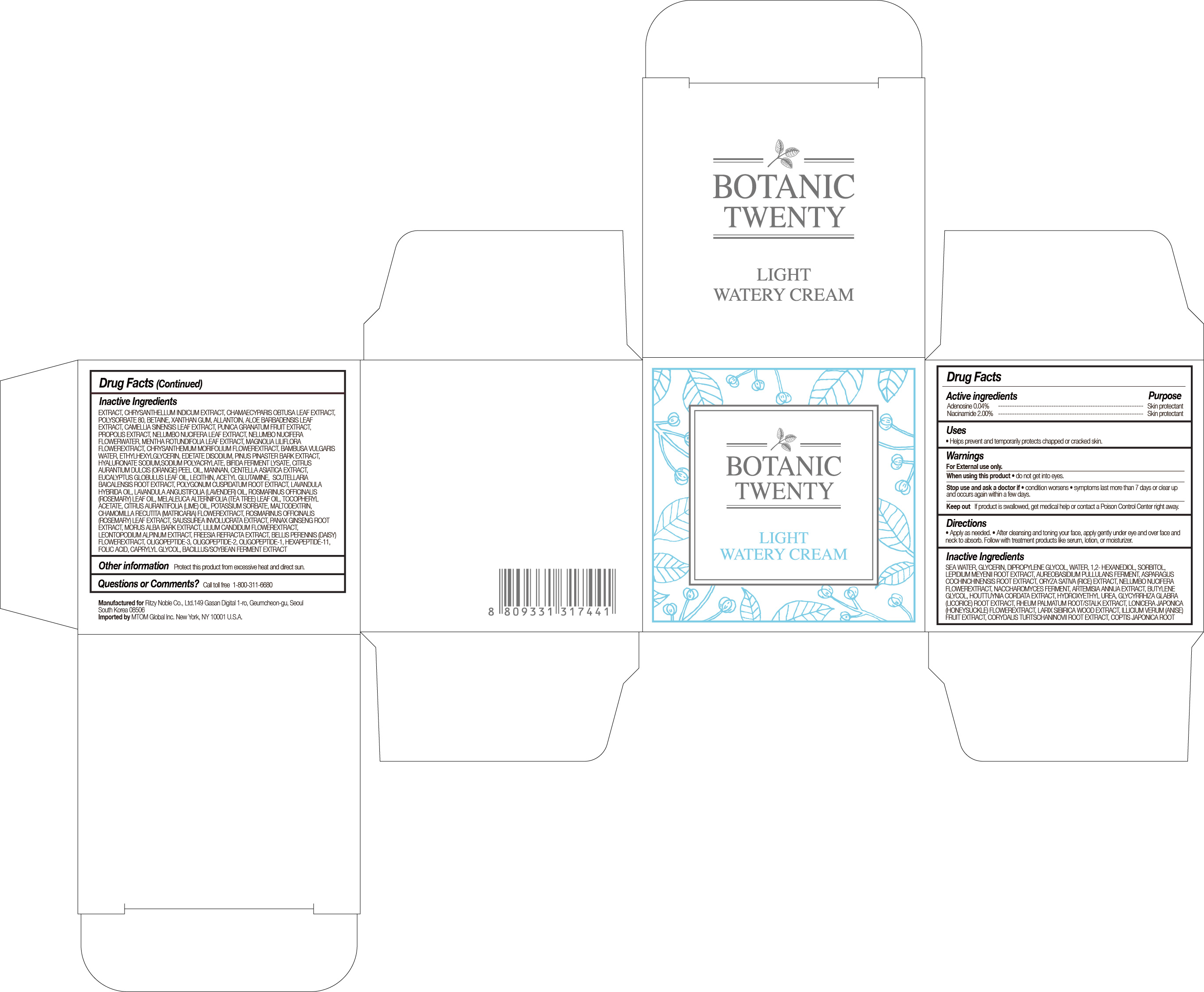 This is a drug information about the "BOTANIC TWENTY LIGHT WATERY CREAM" beauty product. It contains active ingredients Adenosine and Niacinamide. Its inactive ingredients include fruit extracts like apple and pomegranate, allantoin, aloe vera, extracts of Centella asiatica, tea tree, and lavender oils. The cream is suggested to be applied under the eye, face, and neck, after cleansing and toning. In case of any unusual symptoms or specific situations, the product warns to seek medical help or contact a Poison Control Center. The product is physically manufactured in South Korea, and the distributor company is located in New York, USA.*