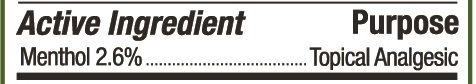 This is a product label for a topical analgesic that contains 2.6% Menthol as the active ingredient. Menthol is known for its pain-relieving properties when applied topically.*