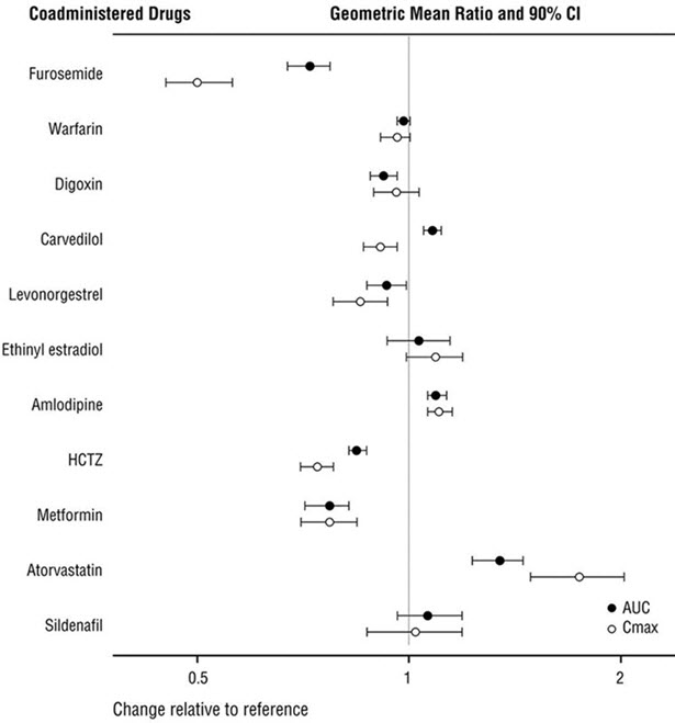 This text provides information on the geometric mean ratio and 90% confidence interval for several drugs when coadministered with other drugs. The drugs mentioned include Furosemide, Warfarin, Digoxin, Carvedilol, Levonorgestrel, Ethinyl estradiol, Amlodipine, HCTZ, Metformin, Atorvastatin, and Sildenafil. The text suggests a comparison of the drugs' effects when taken together.*