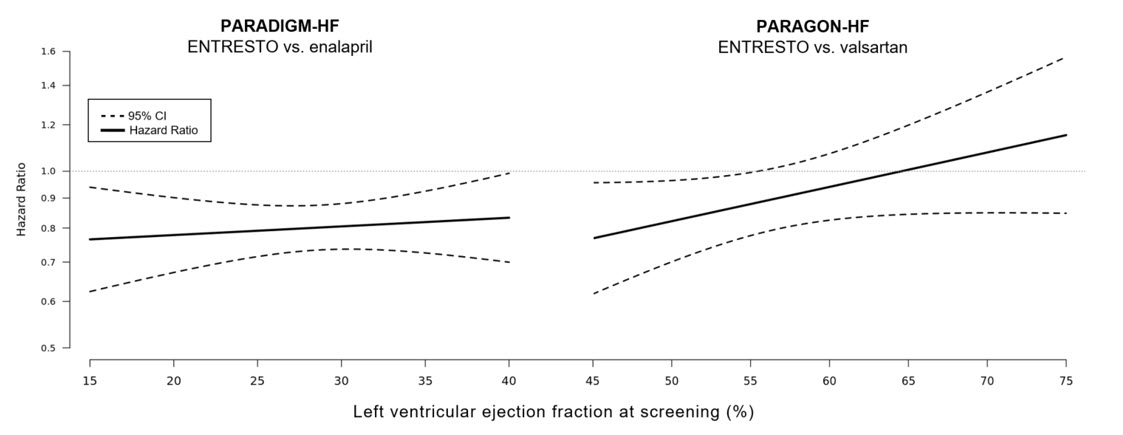 This text shows a comparison of Hazard Ratios for ENTRESTO versus enalapril and valsartan in the PARADIGM-HF and PARAGON-HF trials based on left ventricular ejection fraction values. The graph displays the hazard ratios at various left ventricular ejection fraction percentages. This information is valuable for evaluating the efficacy of ENTRESTO in comparison to traditional heart failure medications.*