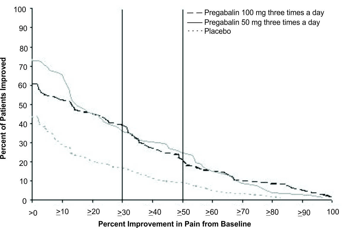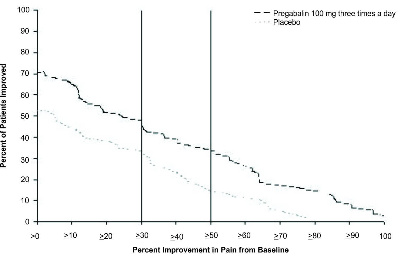 This information provides a graph showing the percentage of patients who improved their pain levels from baseline when taking Pregabalin 100 mg three times a day compared to a placebo. The graph shows a significant improvement in pain as the dosage increases, with 100% of patients experiencing improvement.*