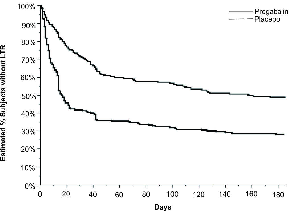 This text shows a table with estimated percentages for "Subjects without LIR" across various levels. The data suggests the effects of Pregabalin compared to Placebo over a period of days ranging from 80 to 180. The percentage of subjects without LIR is not consistently mentioned for all levels.*
