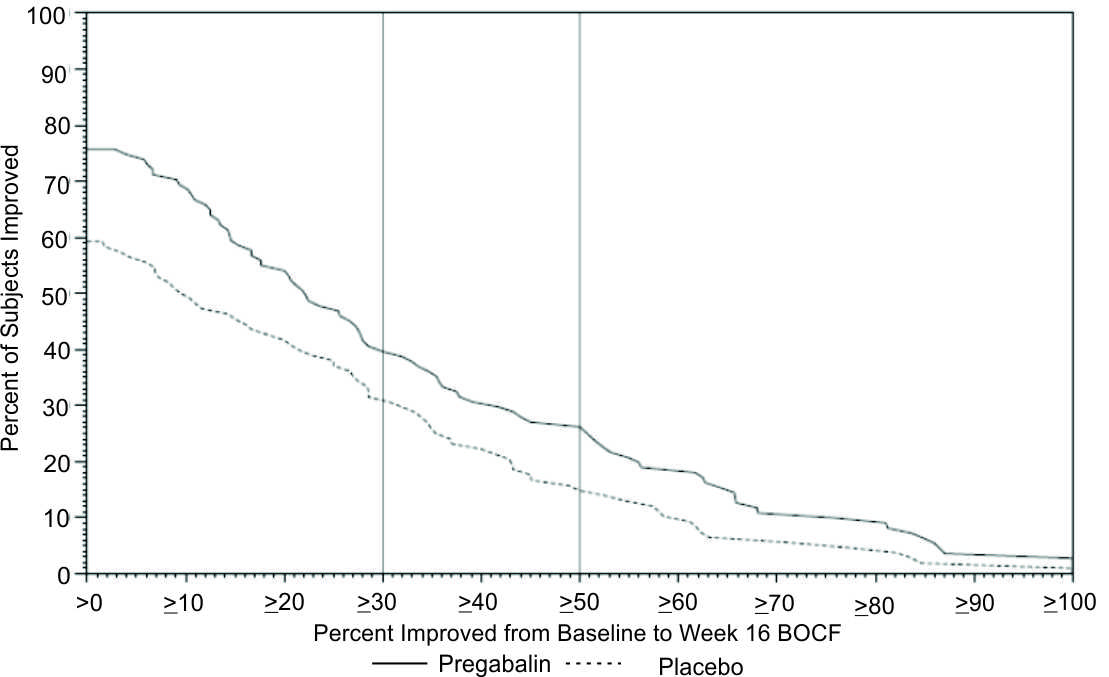 This information appears to be showing the percentage of subjects that improved with Pregabalin compared to Placebo from baseline to week 16 using the BOCF method. The data is presented in ranges, such as >10%, >20%, and so on, up to >80%. The table indicates the percentage of subjects in each category that showed improvement.*