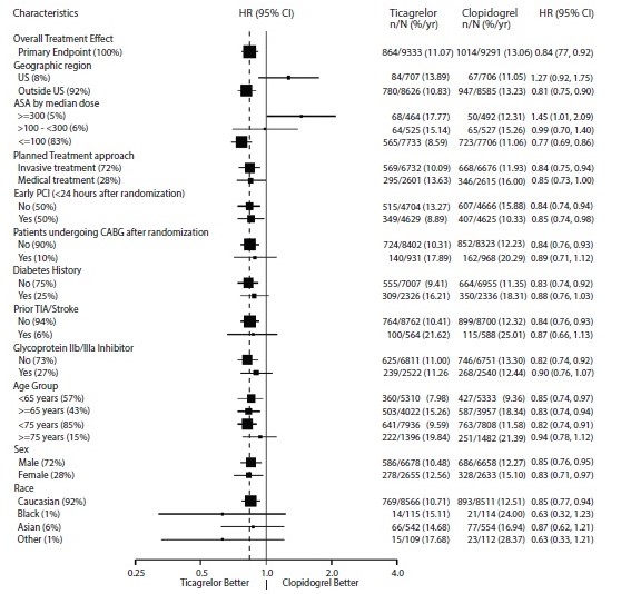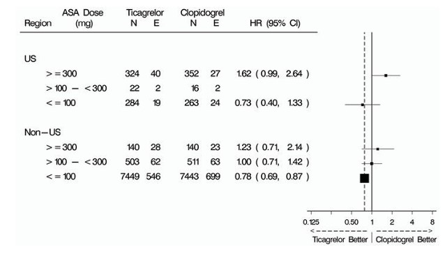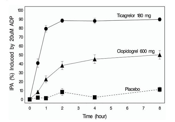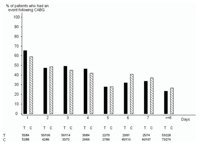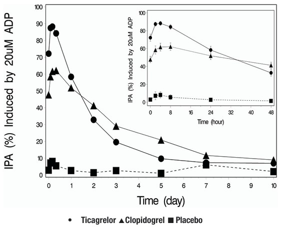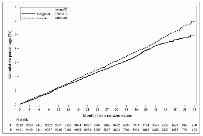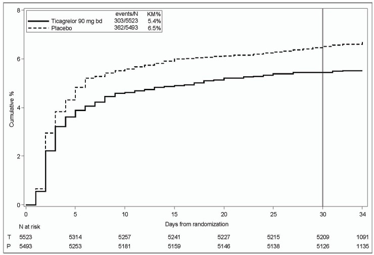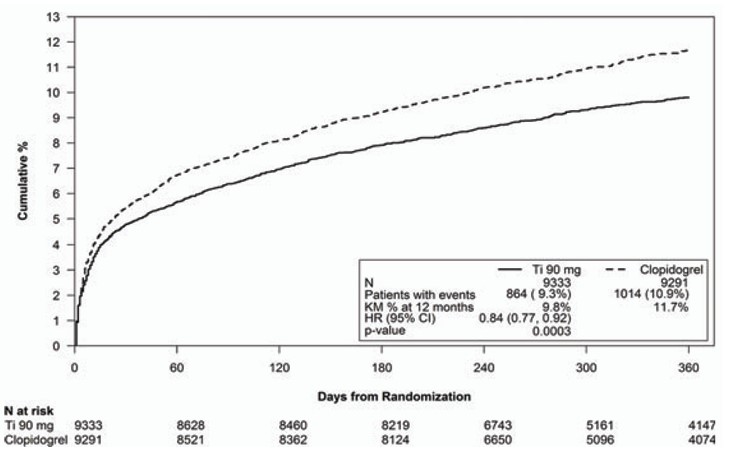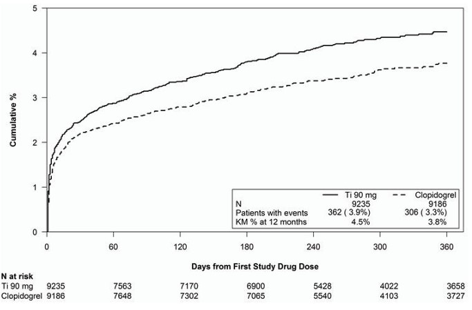This text provides data on the comparison between two groups of patients receiving different medications, Ti%0mg and Clopidogrel. It includes the number of patients with events, Kaplan-Meier percentage at 12 months, and the number of days from the first study drug dose. The comparison shows the percentage of patients experiencing events and their respective risks at different time points.*