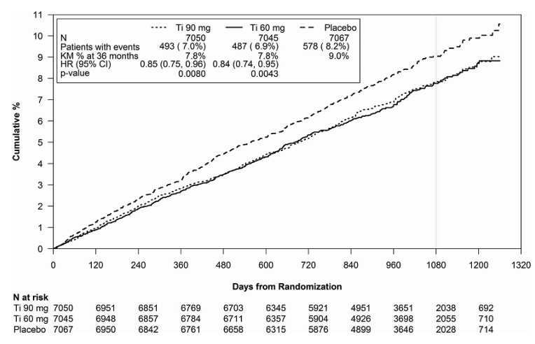 This is a statistical data for patients in a study evaluating the efficacy of medications. The table shows the cumulative percentage of patients over time, number of patients with events, Kaplan-Meier percentage at 12 months, hazard ratio, p-value, and days from randomization for two groups: Tiwom and Clopidogrel. The data suggests a higher percentage of events in the Tiwom group compared to the Clopidogrel group.*