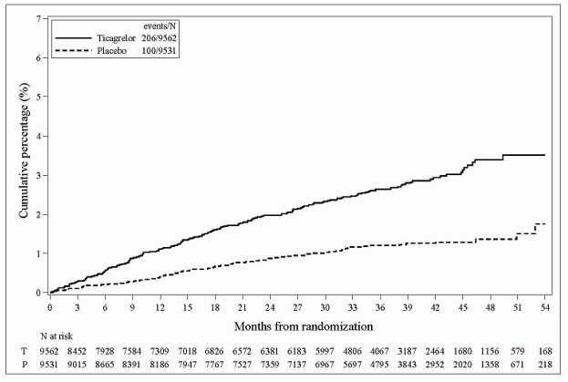 This text appears to provide information about a clinical trial or study involving Ticagrelor 90 mg and a Placebo. It also includes data related to the days from randomization.*