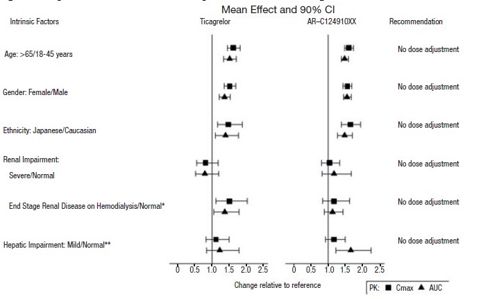 This text provides information on intrinsic factors affecting the dosage adjustment recommendations for Ticagrelor AR-C1249100. It includes criteria such as age (greater than 65 or 18-45 years), gender (female or male), ethnicity (Japanese or Caucasian), renal impairment (severe or normal), end-stage renal disease on hemodialysis or normal, and hepatic impairment (mid-normal). The text also mentions the mean effect and 90% confidence interval. The chart shows the recommended dose adjustment based on different criteria for Ticagrelor AR-C1249100.*