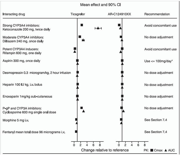 This is a list detailing drug interactions with Ticagrelor. It categorizes different drugs based on their impact on CYP enzymes and whether dose adjustments are required when co-administered with Ticagrelor. The information can be helpful for healthcare professionals managing patients on Ticagrelor therapy to avoid potential adverse effects or reduced efficacy.*