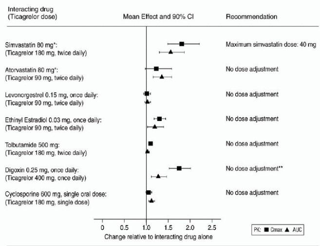 This text provides information on how Ticagrelor interacts with various drugs, including Simvastatin, Atorvastatin, Levonorgestrel, Ethinyl Estradiol, Tolbutamide, Digoxin, and Cyclosporine, specifying the recommended doses and adjustments required for the concurrent use of these medications. It outlines the mean effect and 80% confidence interval of Ticagrelor in combination with each drug, along with dosage adjustments or lack thereof to optimize effectiveness and safety.*