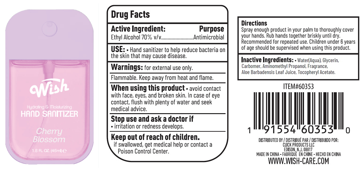 This is a description for a Cherry Blossom Hydrating & Moisturizing Hand Sanitizer spray with 70% ethyl alcohol to help reduce bacteria on the skin. It is effective in killing 99.99% of common germs and bacteria. The product comes in a 12 FL OZ (355ml) bottle and contains ingredients like water, glycerin, and aloe. Instructions include spraying enough product on the palm to cover hands and warnings to avoid contact with face, eyes, and mouth. It is distributed by CLICK PRODUCTS LLC and made in China.*