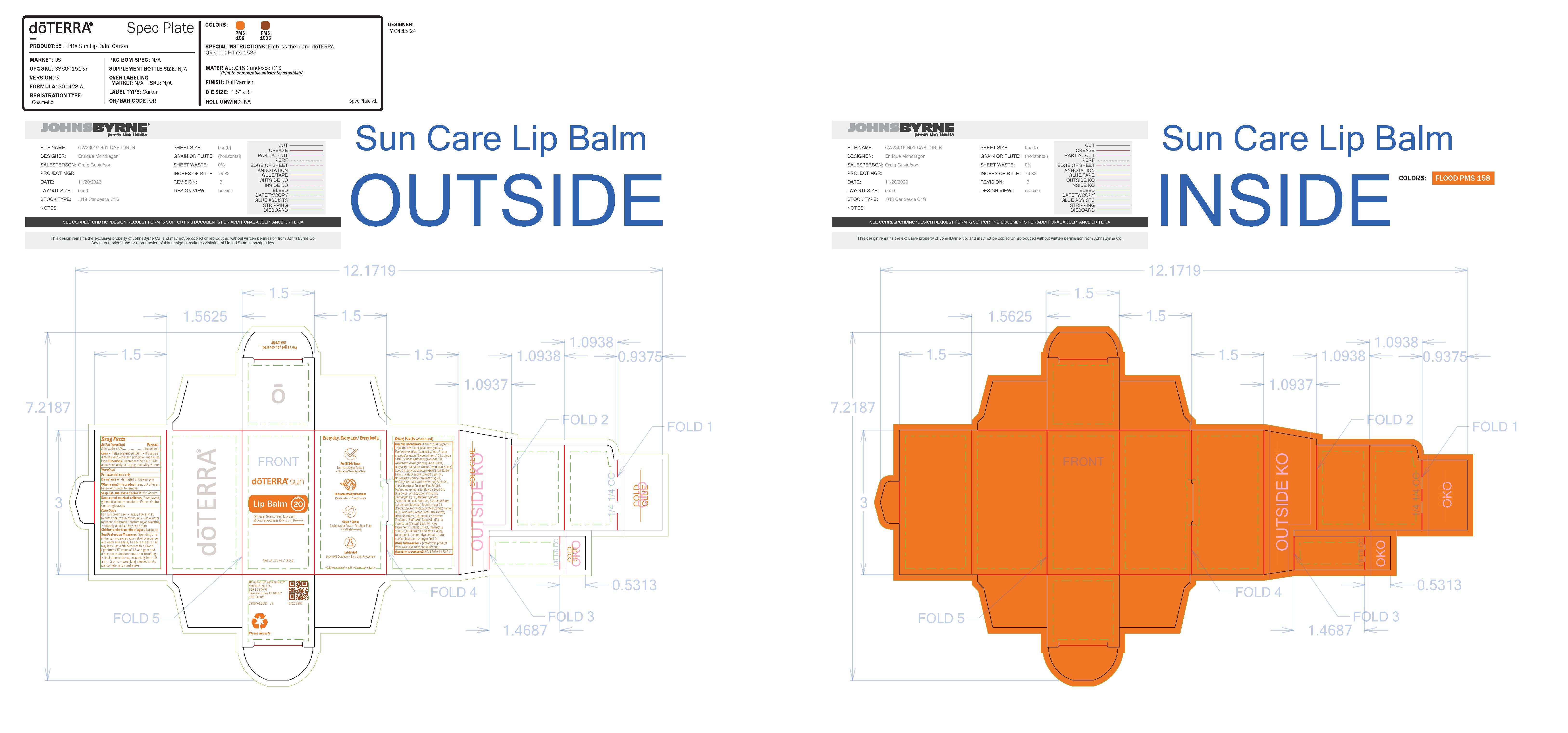 This is a detailed product description for a doTERRA Sun Lip Balm Carton designed by Enrique Mondragon. It includes special instructions for embossing, product details such as SKU and bottle size, finishing details like dull varnish, and information on the design layout. Additionally, the document features drug facts, active ingredients, warnings, directions for use, and other relevant product information. The design is specified to be the property of JohnsByrne Co., and there are copyright warning notices included.*