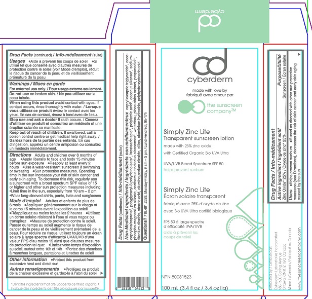 This is a drug description for "Simply Zinc Lite Transparent Sunscreen Lotion" by the brand Cyberderm. The drug facts are available on the packaging with a barcode number of 75800 1 pac.*