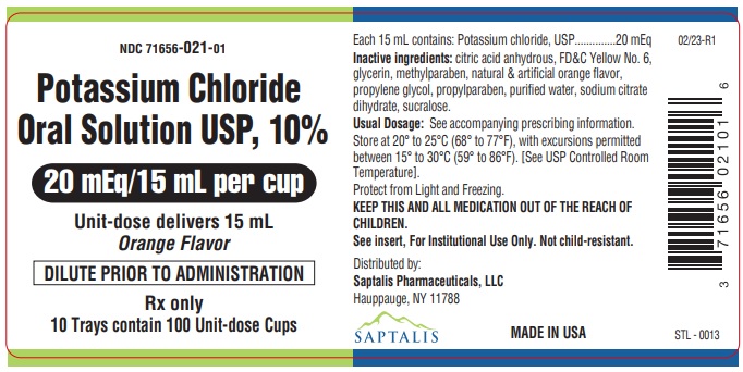 This is a description of a medication called Potassium Chloride Oral Solution. It is a 10% solution that contains 20 mEq of potassium chloride per 15 mL unit dose cup. The solution has an orange flavor and should be diluted before administration. The medication is only available with a prescription. Each tray contains 50 unit-dose cups. The solution also contains inactive ingredients such as citric acid, FDAC Yellow No. 6, glycerin, methylparaben, natural and artificial orange flavor, propylene glycol, propylparaben, purified water, sodium citrate dihydrate, and sucralose. The medication should be stored at a temperature between 20°C and 25°C (66°F to 77°F) with excursions permitted between 15°C and 30°C (59°F to 86°F). It should be protected from light and freezing. It is important to keep this medication out of reach of children. This medication is for institutional use only and is not child-resistant. The medication is distributed by Saptalis Pharmaceuticals, LLC in Hauppauge, NY.*