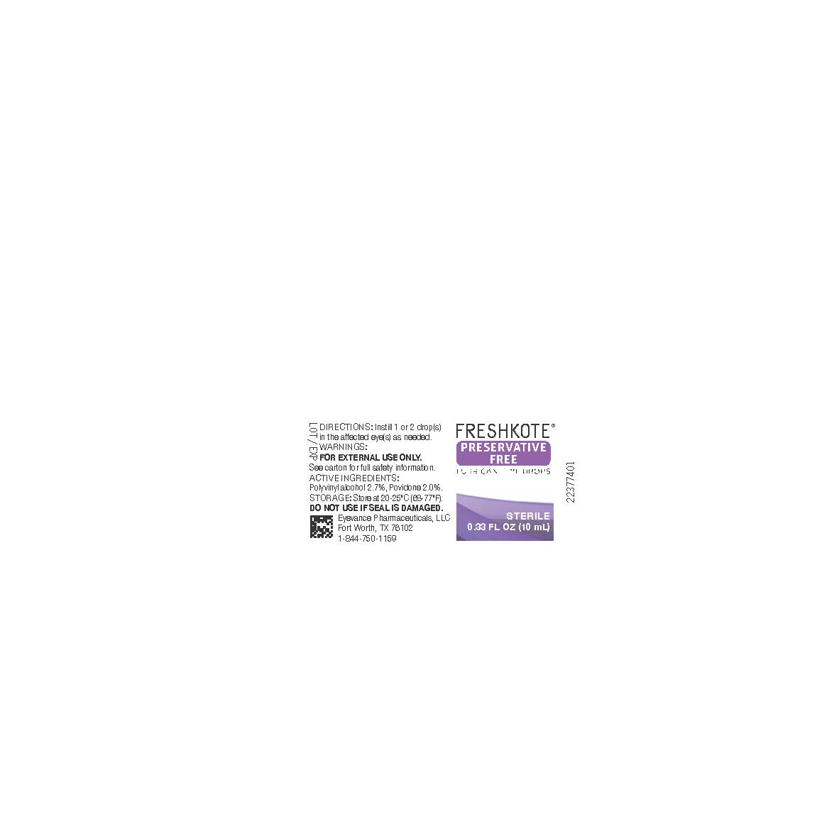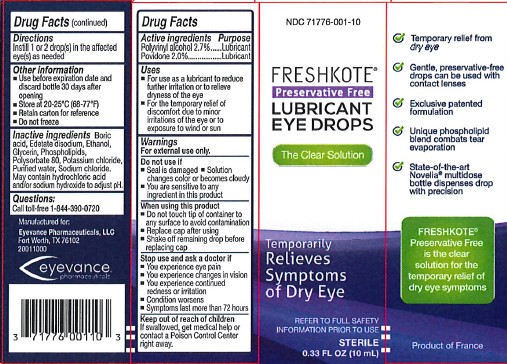 The following 3 images provide visual information about the product associated with Freshkote Preservative Free Lubricant Eye Drops NDC 71776-001 by Eyevance Pharmaceuticals, such as packaging, labeling, and the appearance of the drug itself. This resource could be helpful for medical professionals, pharmacists, and patients seeking to verify medication information and ensure they have the correct product.