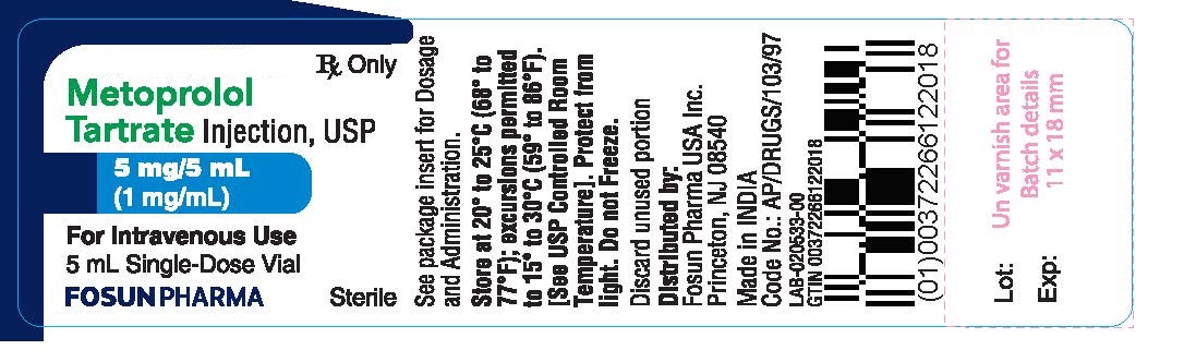 Injection: 5 mg metoprolol tartrate as a clear liquid supplied in 5 mL clear vials.