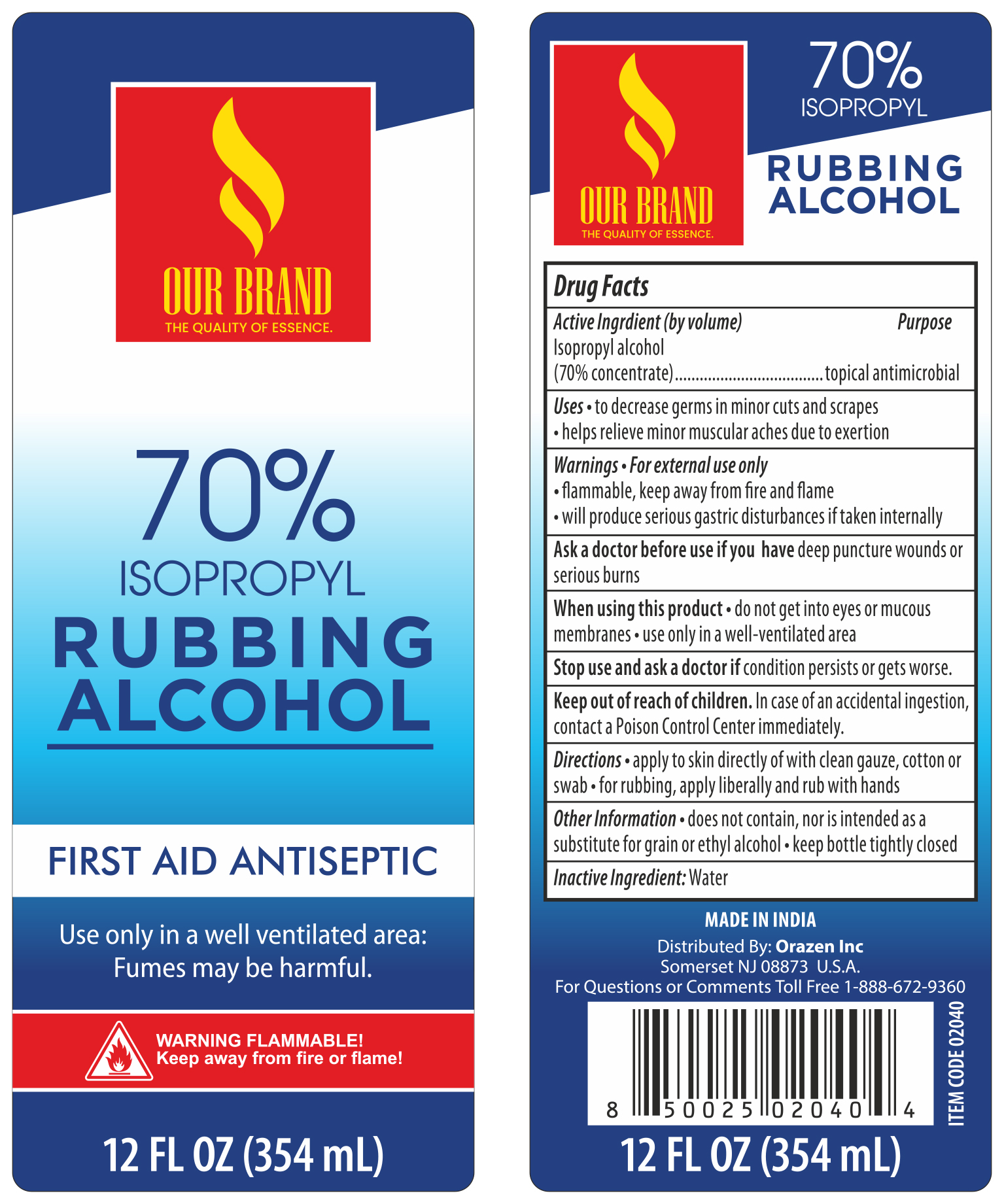 This is a description for a bottle of Isopropyl Rubbing Alcohol, a first aid antiseptic. It contains 70% Isopropyl alcohol used to decrease germs in minor cuts and scrapes, as well as relieve minor muscular aches. The product is for external use only and should be kept away from fire and flame due to flammability. It warns against internal use, eye contact, and mucous membrane contact. It provides directions for applying to the skin and contains water as an inactive ingredient. The product is made in India and distributed by Orazen Inc in the U.S.A. Contact Poison Control immediately in case of accidental ingestion, and keep the bottle tightly closed.*
