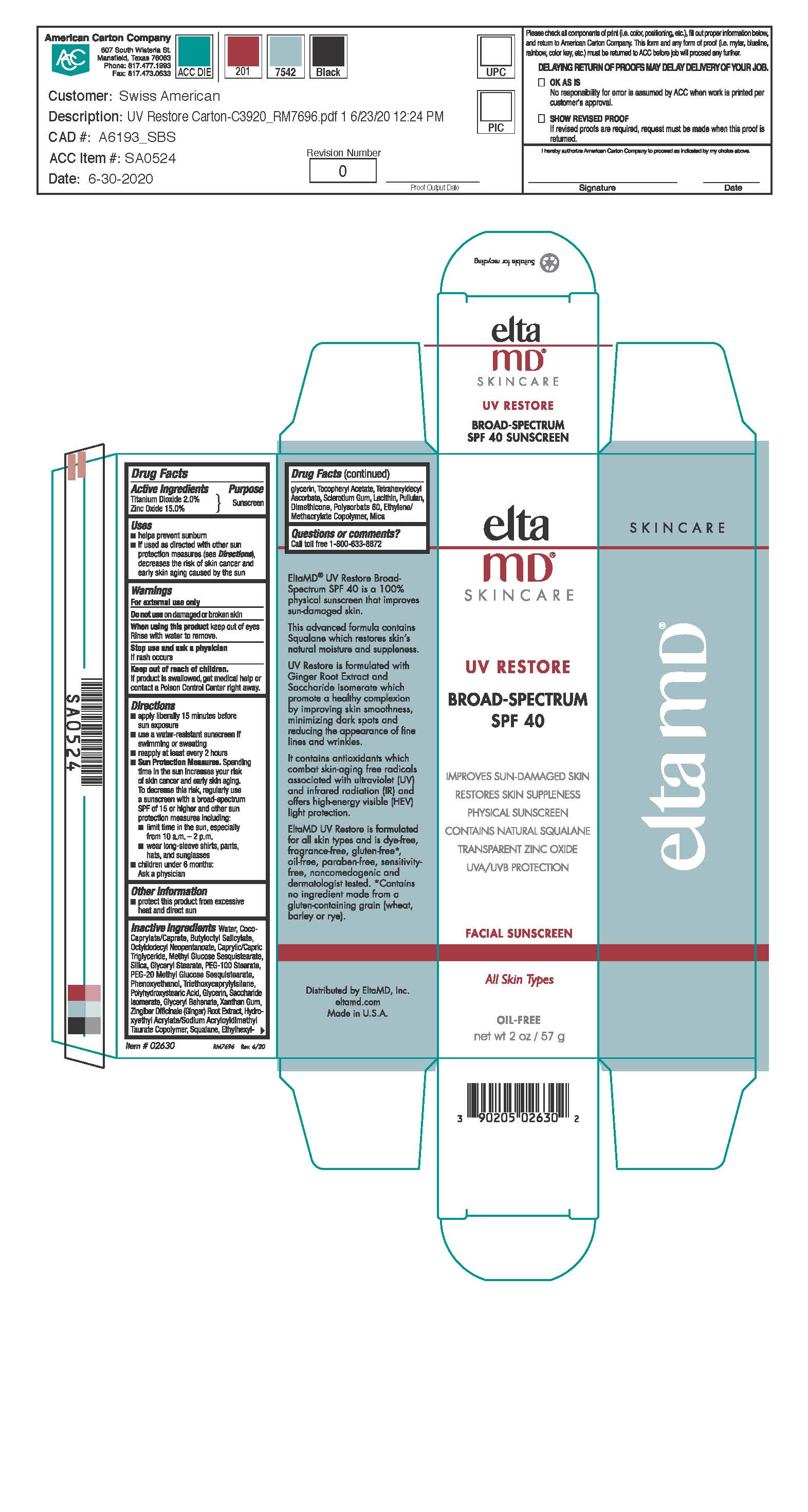 The following image provide visual information about the product associated with Eltamd Uv Restore NDC 72043-2630 by Cp Skin Health Group, Inc, such as packaging, labeling, and the appearance of the drug itself. This resource could be helpful for medical professionals, pharmacists, and patients seeking to verify medication information and ensure they have the correct product.