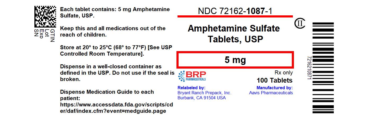 The following 2 images provide visual information about the product associated with Amphetamine Sulfate NDC 72162-1087 by Bryant Ranch Prepack, such as packaging, labeling, and the appearance of the drug itself. This resource could be helpful for medical professionals, pharmacists, and patients seeking to verify medication information and ensure they have the correct product.