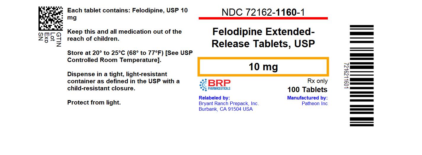 Felodipine Extended-Release Tablets, USP, 10mg is a prescription medication that helps in treating high blood pressure. Each tablet has 10mg of Felodipine. This medication needs to be kept out of the reach of children and should be stored between 20° to 25°C. Protect the medication from light by keeping it in a tight, light-resistant container with a child-resistant closure. It comes in a pack of 100 tablets and is only dispensable with a valid prescription. The medication is manufactured by Patheon Inc and relabeled by Bryant Ranch Prepack, Inc. NDC 72162-1160-1.*